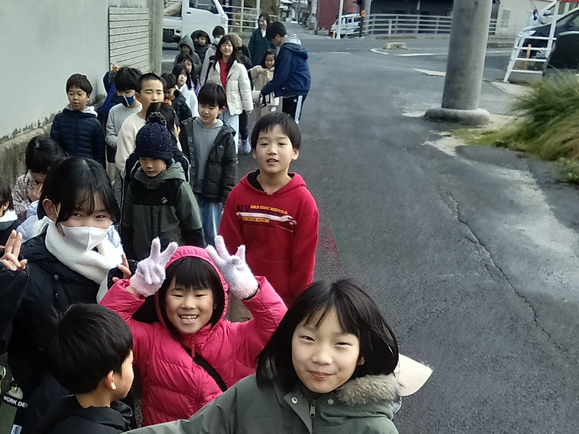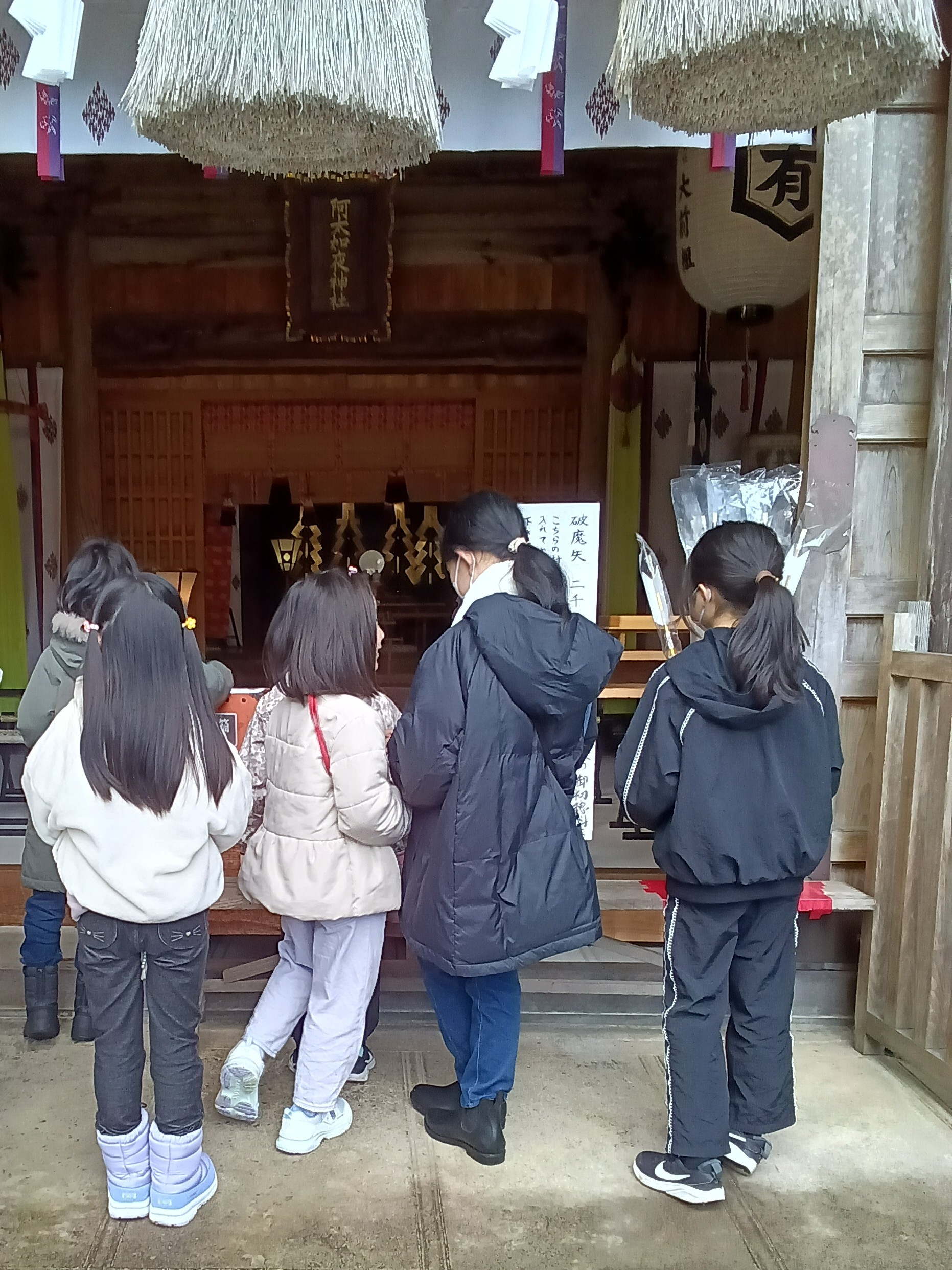 新年を迎えて、毎年恒例、出雲郷地区の氏神様「阿太加夜(あだかや)神社」へ初詣に行きました。約一キロの道中を高学年の子どもたちが低学年の友だちを気遣いながら、並び順や歩く速度を工夫する様子に頼もしさを感じる場面が多々ありました。