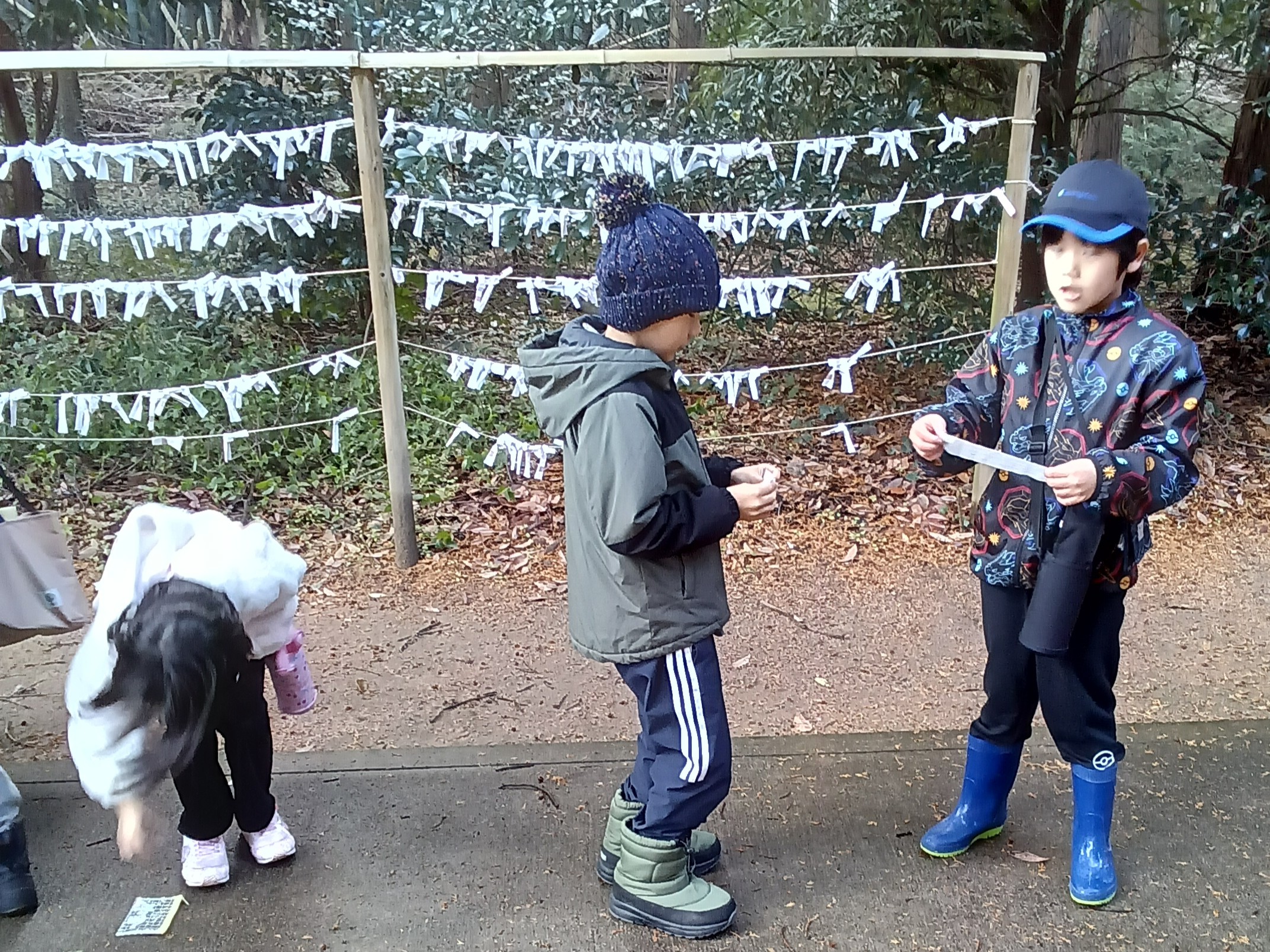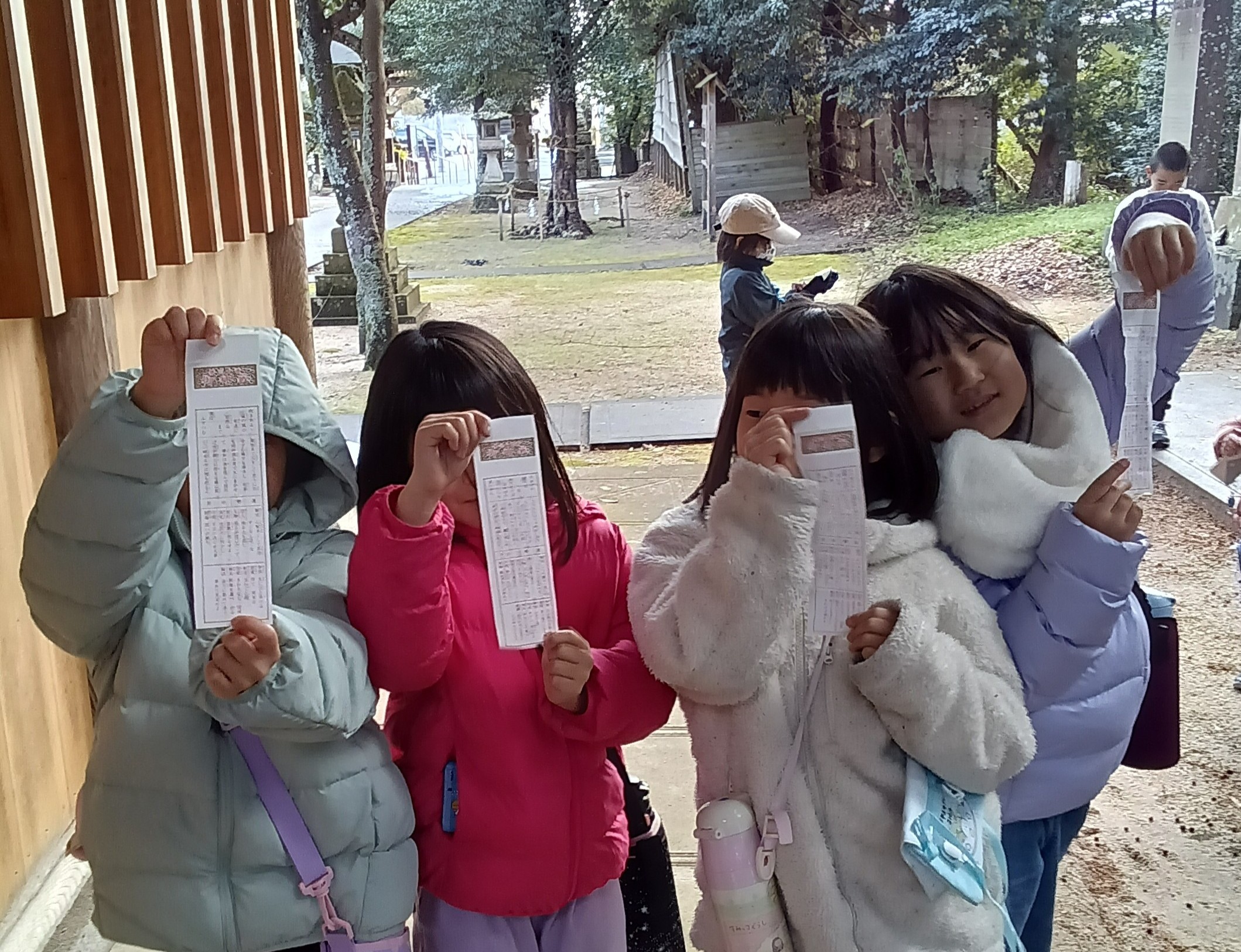 神社に到着して「二礼二拍手一礼」の後、一人ひとりが手を合わせて目を閉じ、静かな心でお願いごとをしました。子どもたちは、神社の神聖な空気の中でとても穏やかな気持ちになったようです。その後は楽しみにしていたおみくじを引きました。